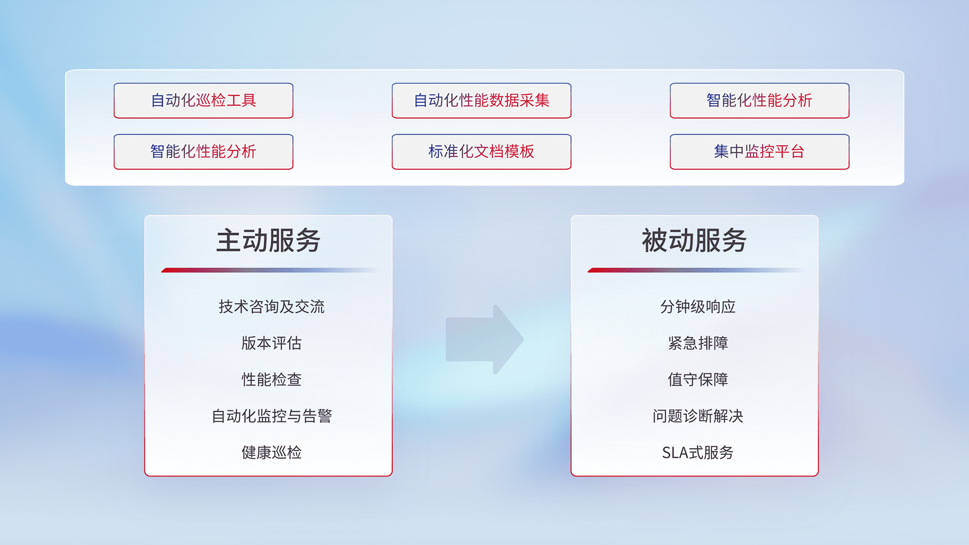 智能化工具和标准化文档,,,保障服务质量,,,,提供主动服务(包含技术咨询、、、版本评估、、性能检查、、自动化监控与告警、、健康巡检)和被动服务包含(分钟级响应、、、紧急排障、、、值守保障、、、、问题诊断解决、、、、SLA服务)。。